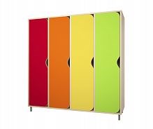 Шкаф для одежды детский четырёх секционный предназначен для раздевалок дошкольных учреждений. Изготовлен из ЛДСП 16 мм ,все торцы обработаны кромкой ПВХ . Внутри оборудован полочкой для верхних головных уборов, двумя крючками для одежды. Стоит на закрепленных регулируемых хромированных опорах.Кромка фасада и корпус шкафа исполняется в цвете молочный дуб. Дверь шкафа имеет выемку для руки, что позволяет легко открывать дверь ребенку и исключает возможность травмироваться ручкой. Вся продукция сертифицирована.