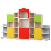 Стенка для детских пособий и игрушек оформлена в стиле горка . Рельефные украшения, ниши, полочки придают ей привлекательность и красоту. Материал исполнения: ламинированная ДСП толщиной 16 мм, цвет — "бук бавария светлый. Цветовое разрешение возможно по желанию заказчика. Стенка функционально используется для хранения игрушек и пособий в дошкольных учреждениях.